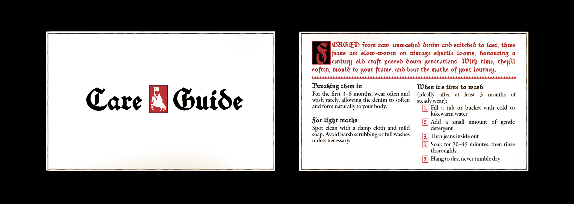 The denim care card extends this language into a functional format. Here, the knight is abstracted into a condensed icon, estvablishing a companion piece that complements the label while keeping the two designs consistent.
